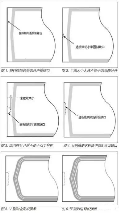 而較為理想的便于剝離打開的設(shè)計,除兩層材料開啟剝離處錯位外,是將開啟處的紙張切掉3~4mm 左右寬的矩形凹缺口(如圖 4 所示),這樣既便于塑料膜與透析紙的分開,又便于分開后雙手的拿捏,且總體不浪費使用面積。